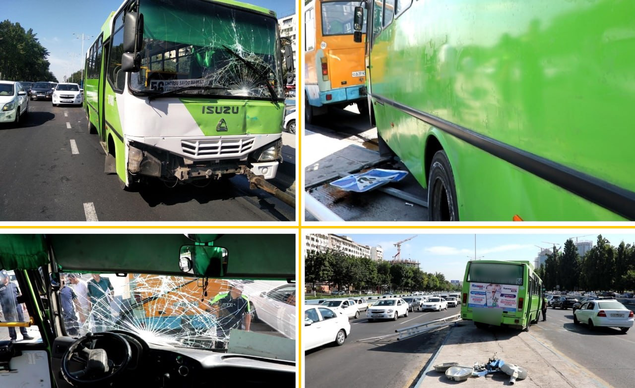 “Isuzu” rusumli avtobus rul boshqaruvini yoʻqotib, yoʻl chetidagi metall yoritgich ustunig...