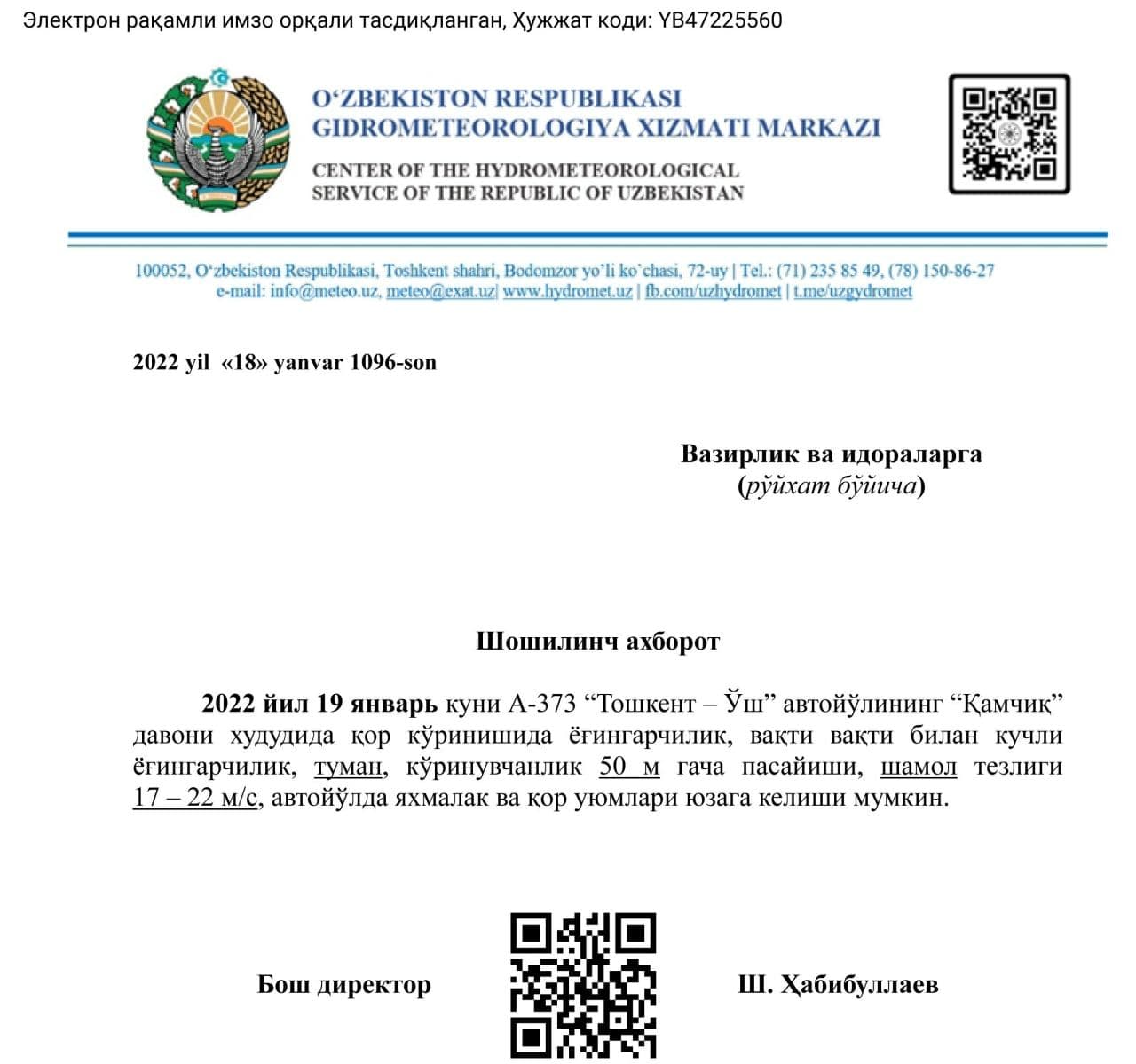 Ertaga, 19-yanvar kuni “Qamchiq” dovonida kuchli yogʻingarchilik (qor va yomgʻir) boʻlishi...