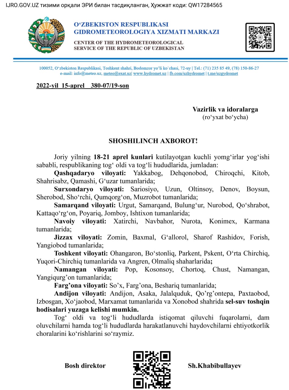 "O‘zgidromet" shoshilinch axborot e’lon qildi