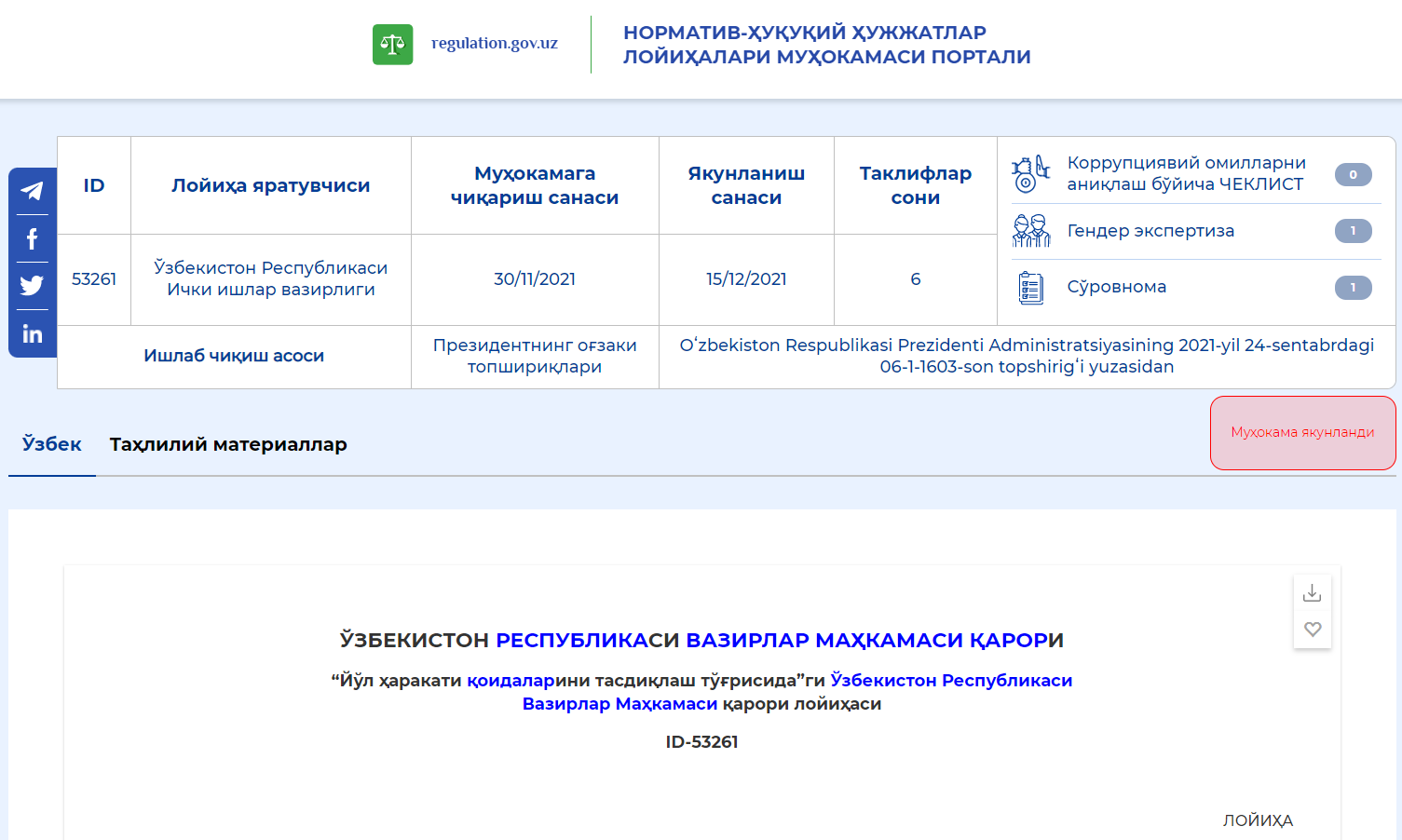 Ijtimoiy tarmoqda “Vazirlar Mahkamasi yangi yoʻl harakati qoidalarini jamoatchilik muhokam...