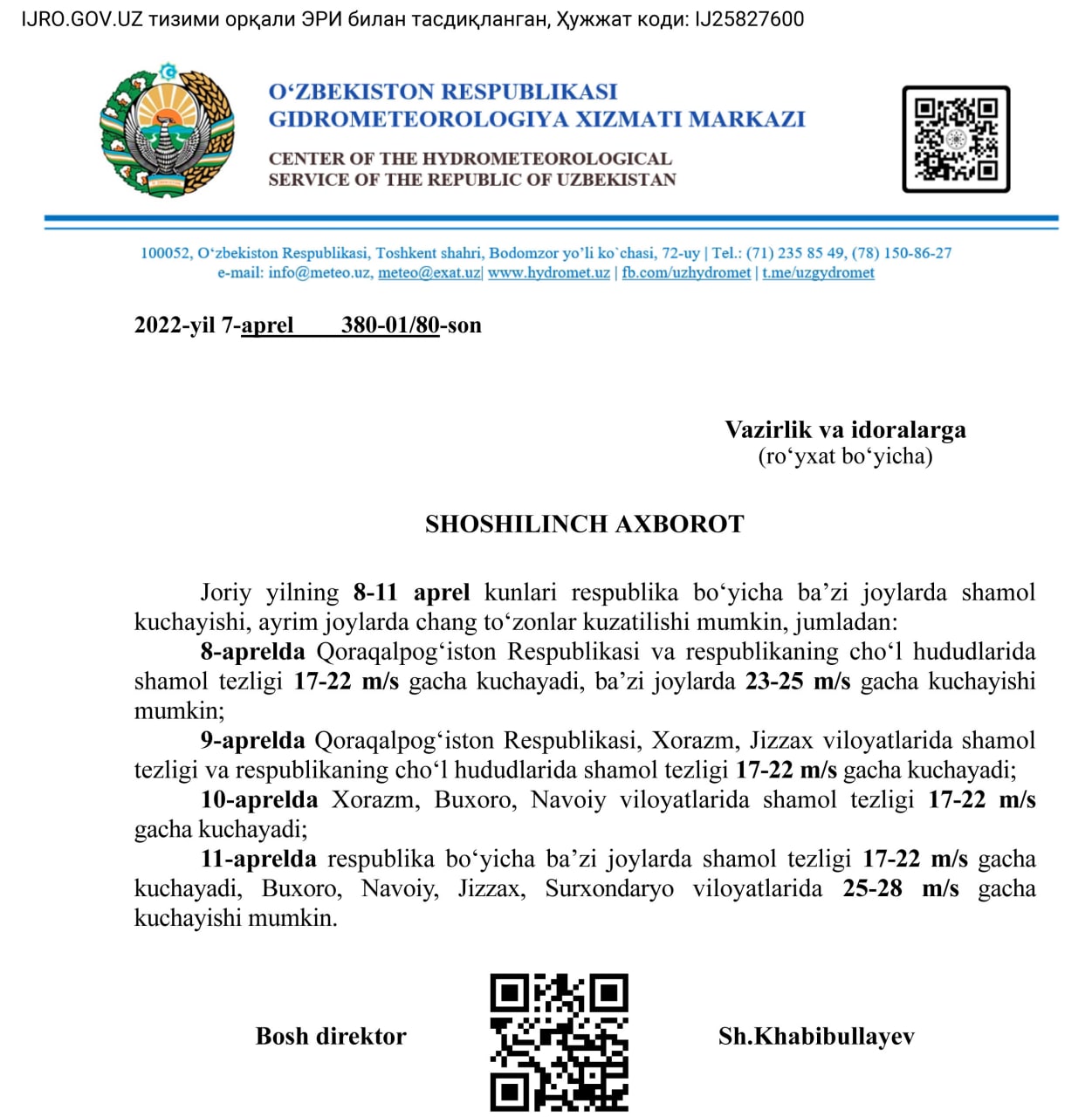 “Oʻzgidromet” shoshilinch axborot eʼlon qildi