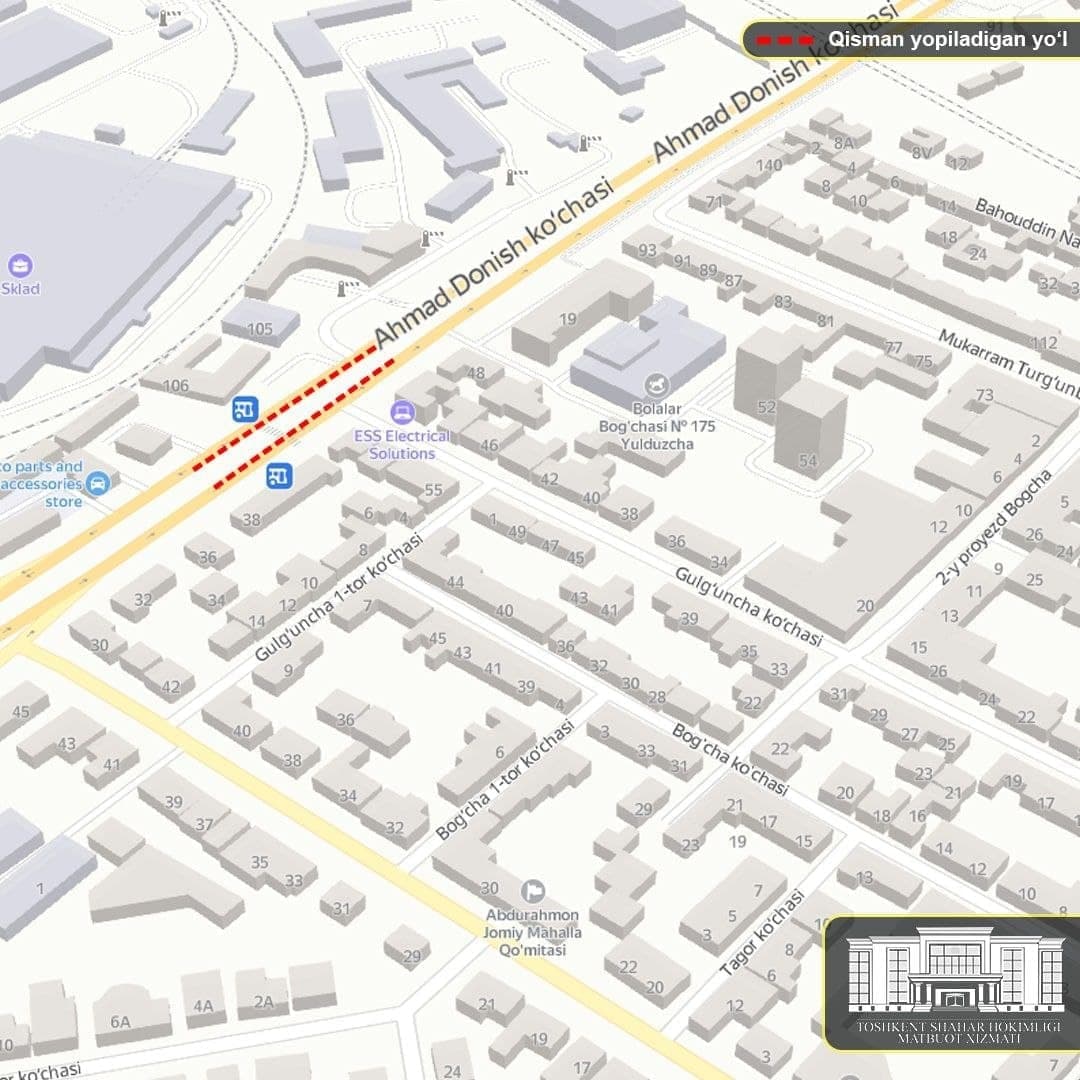 Poytaxtdagi Ahmad Donish koʻchasining maʼlum qismi vaqtincha yopilmoqda