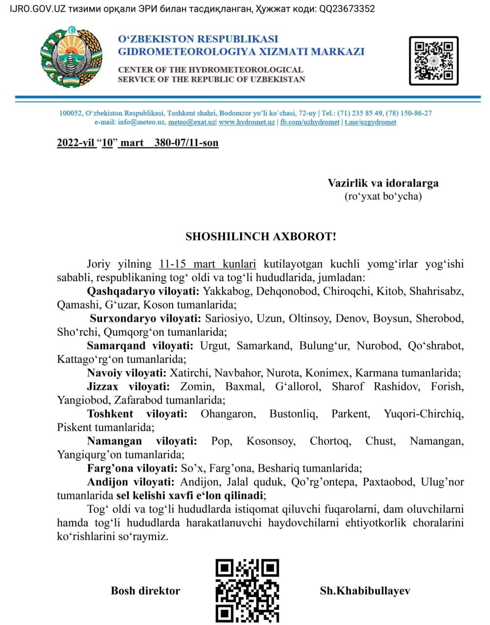 Kuchli yomgʻir yogʻishi kutilayotganligi munosabati bilan shoshilinch axborot