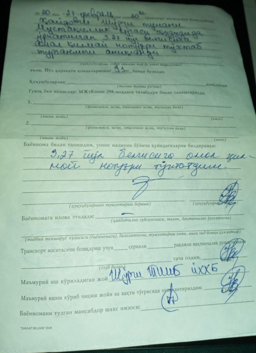 Жорий йилнинг 27 февраль куни Сурхондарё вилояти, Шўрчи тумани, Мустақиллик кўчасида “Йўл ҳаракати қоидалари”нинг 3.27. “Тўхташ тақиқланган” йўл белгиси таъсир доираси остида “Ласетти” русумли давлат рақам белгиси 75 679 VSF бўлган хизмат автомашинасини қолдириб кетган Сурхондарё вилояти ИИБ ЙҲХБ ЙПХО 4-сафарбар гуруҳи командири Б.Эргашевга нисбатан ўрнатилган тартибда маъмурий баённома тузилди.