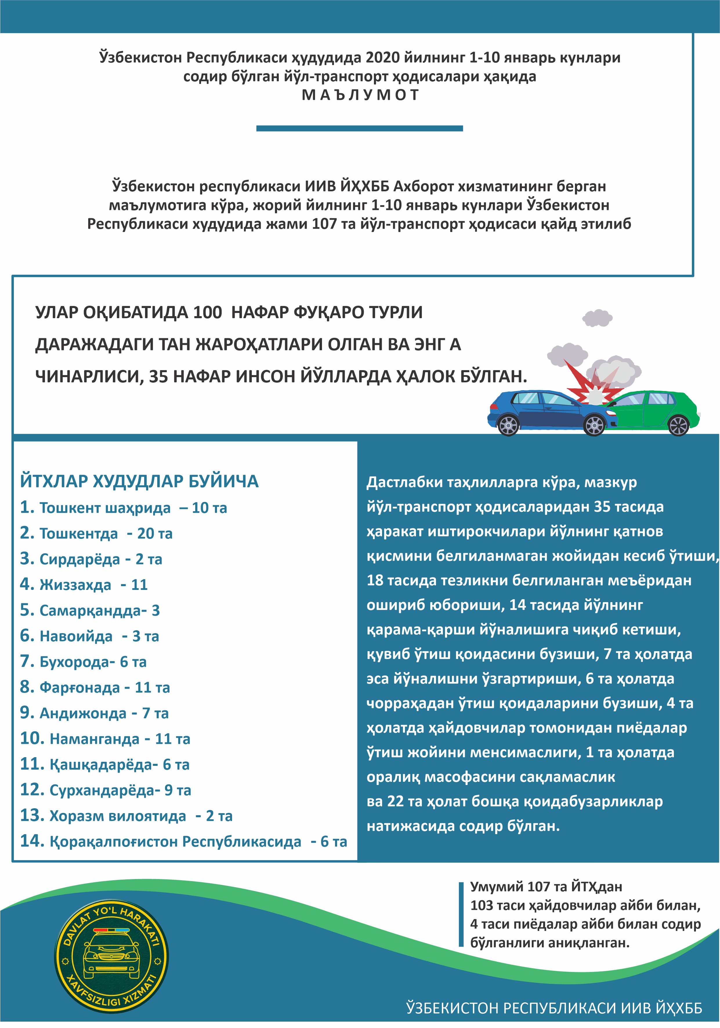 2020 йилнинг 1-10 январь кунлари республикада содир бўлган йўл-транспорт ходисалари бўйича...