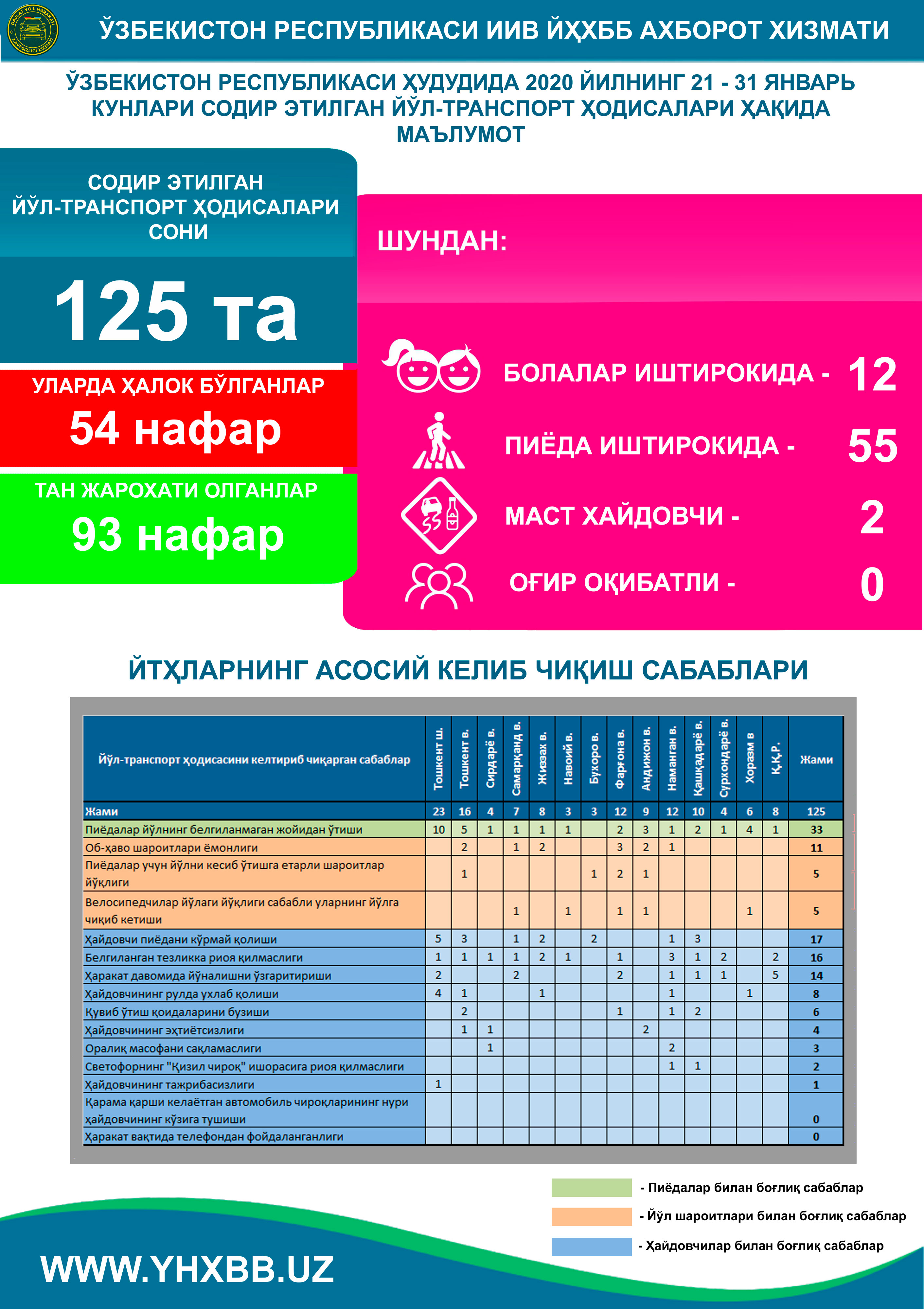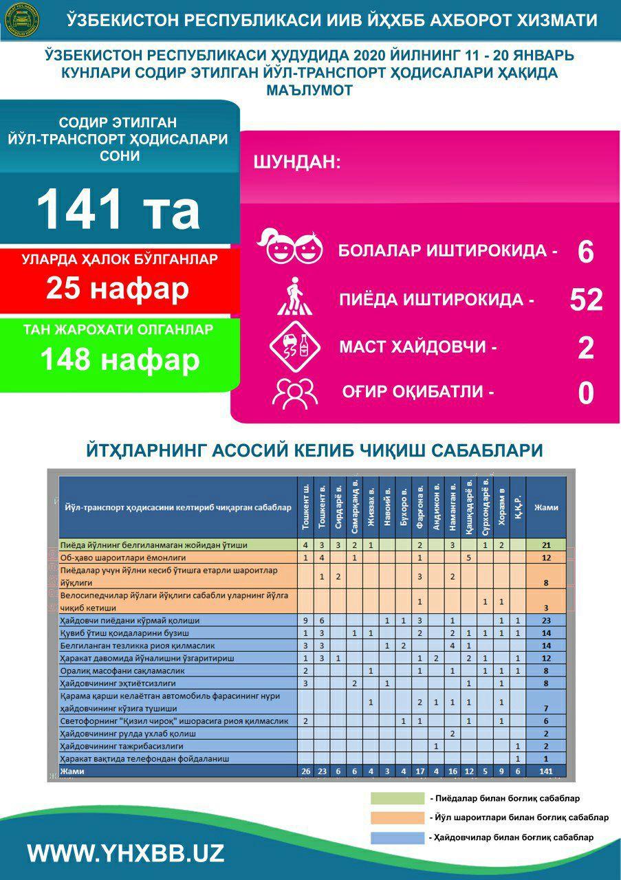 Ўзбекистон Республикаси ҳудудида 2020-йилнинг 11-20 январь кунлари содир этилган йўл-транс...