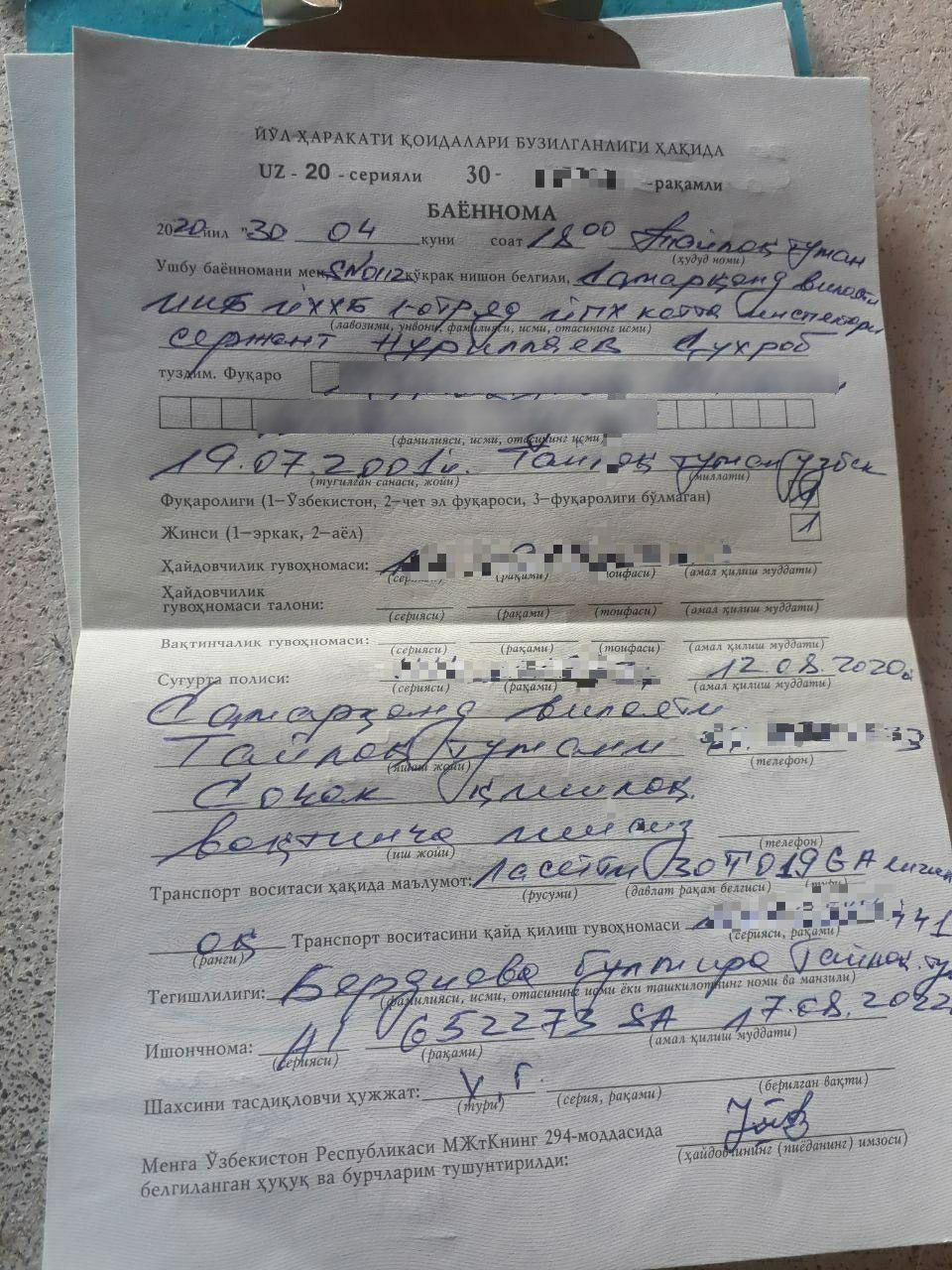 Олиб борилган суриштирув ҳаракатлари давомида ушбу транспорт воситаси Самарқанд вилояти, Тойлоқ тумани “Сочак” маҳалласида яшовчи 2001 йилда туғилган И.Ж.га тегишли эканлиги ва у ҳақиқатдан ҳам ушбу транспорт воситасини олд ойналарига мумкин бўлмаса ҳам ва ён ойналарига ДЙҲХХ рухсатномасисиз ўзбошимчалик билан қора қоплама ёпиштирганлиги аниқланиб, унга нисбатан “Йўл ҳаракати қоидалари”нинг 7.3 банди талабларини бузганлиги учун 2020 йил 30 апрель куни Самарқанд вилояти ИИБ ЙҲХБ ЙПХ катта инспектори С.Нуруллаев томонидан маъмурий баённома расмийлаштирилиб, транспорт воситаси вақтинчалик сақлаш учун жарима майдончасига жойлаштирилди.