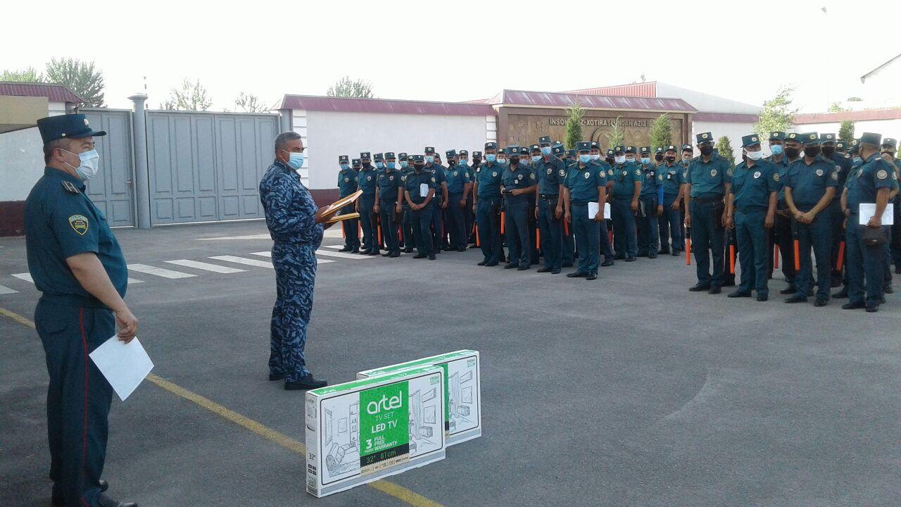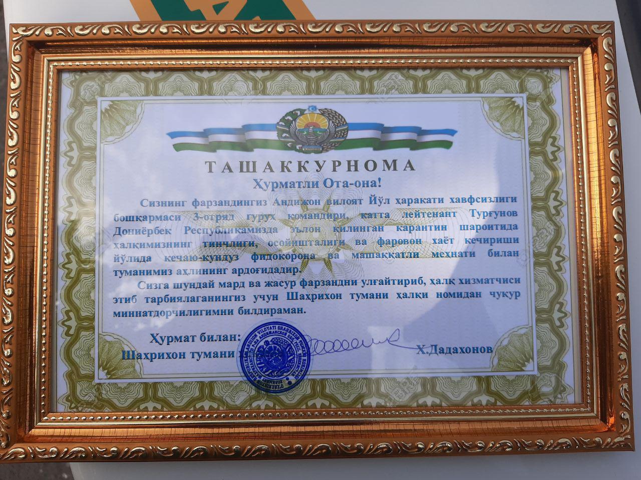 Бугун 28 май куни Андижон вилояти ИИБ ЙҲХБда ўтказилган эрталабки йўриқномада, пандемияга қарши кураш мақсадида жорий этилган карантин даврида намунали хизмат олиб бораётган Андижон вилояти, Шаҳрихон тумани ИИБ ЙҲХГ катта инспектори Б.Абдусатторов ва вилоят ИИБ ЙҲХБ 3-сафарбарлик гуруҳи командири Д.Турғуновларга Шаҳрихон тумани ҳокимлигининг ташаккурномаси ва қимматбаҳо совғаси топширилди.