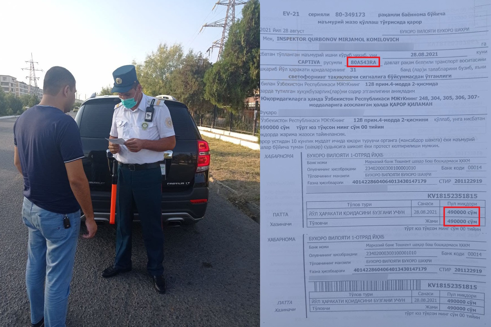 Бухоро вилояти, Бухоро шаҳрида "Captiva" русумли, 80 A543RA давлат рақам белгили автомобиль ҳайдовчиси светофорнинг тақиқловчи чироғига амал қилмаганлиги акс этган видео ижтимоий тармоқда тарқалиб, кенг жамоатчилик эътирозларига сабаб бўлди.