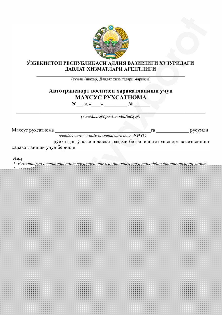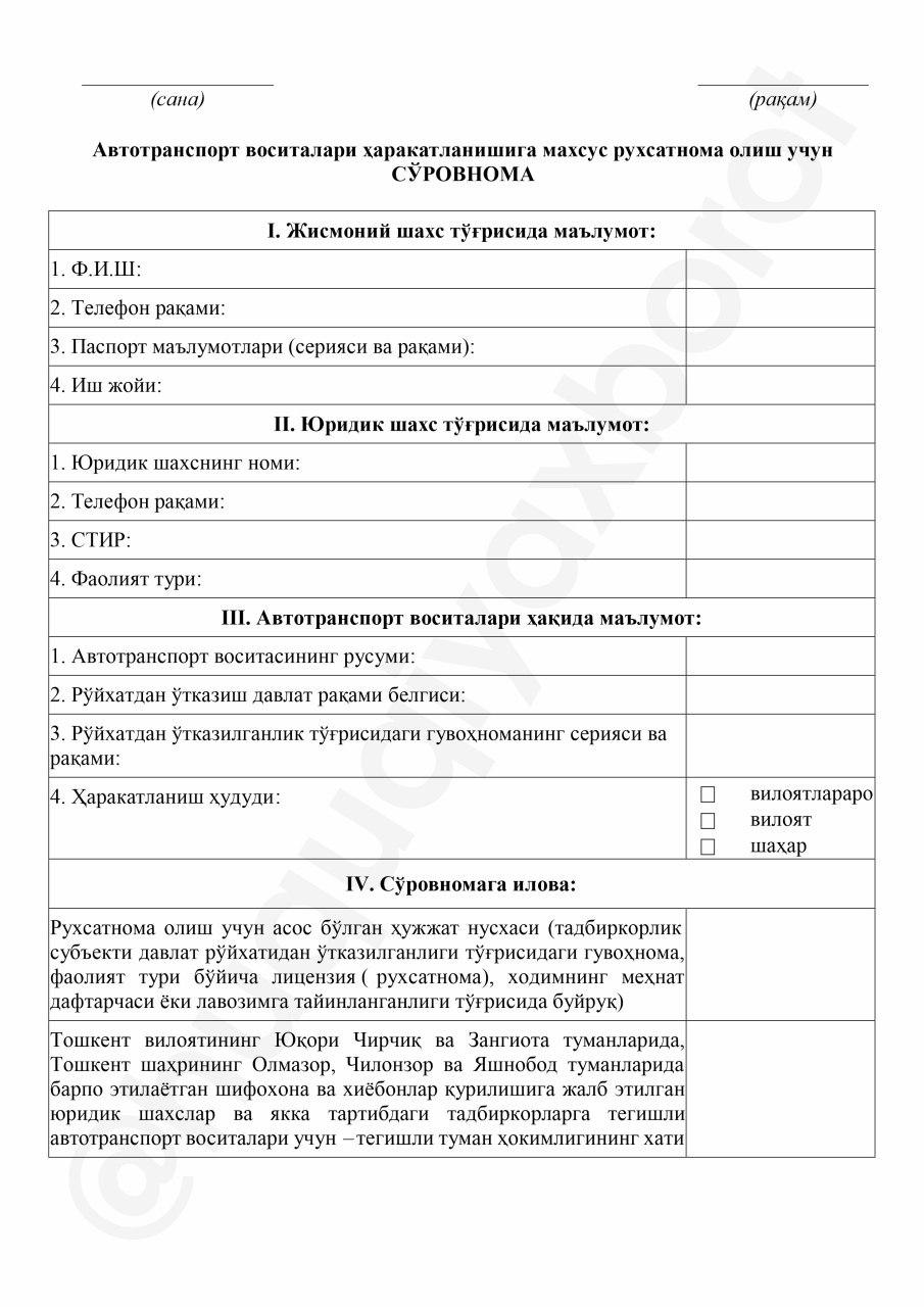 Автотранспорт воситалари ҳаракатланишига махсус рухсатнома олиш учун сўровнома ва автотранспорт воситаси ҳаракатланиши учун махсус рухсатнома намуналари