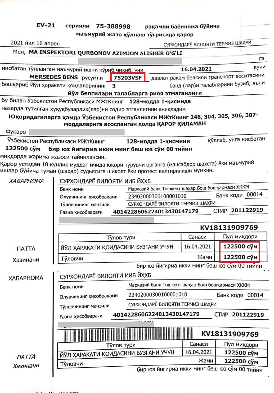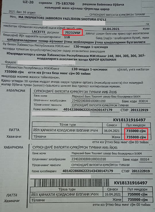 Мазкур видео лавҳалар ўрганилиб, "Mercedes-benz" русумли, 75 203 VSF давлат рақам белгили махсус хизмат автомобили бириктирилган Ш.Т. ҳамда "Ласетти" русумли, 75 232 VSF давлат рақам белгили махсус хизмат автомобили бириктирилган Ф.А.га нисбатан белгиланган тартибда чора кўрилди.