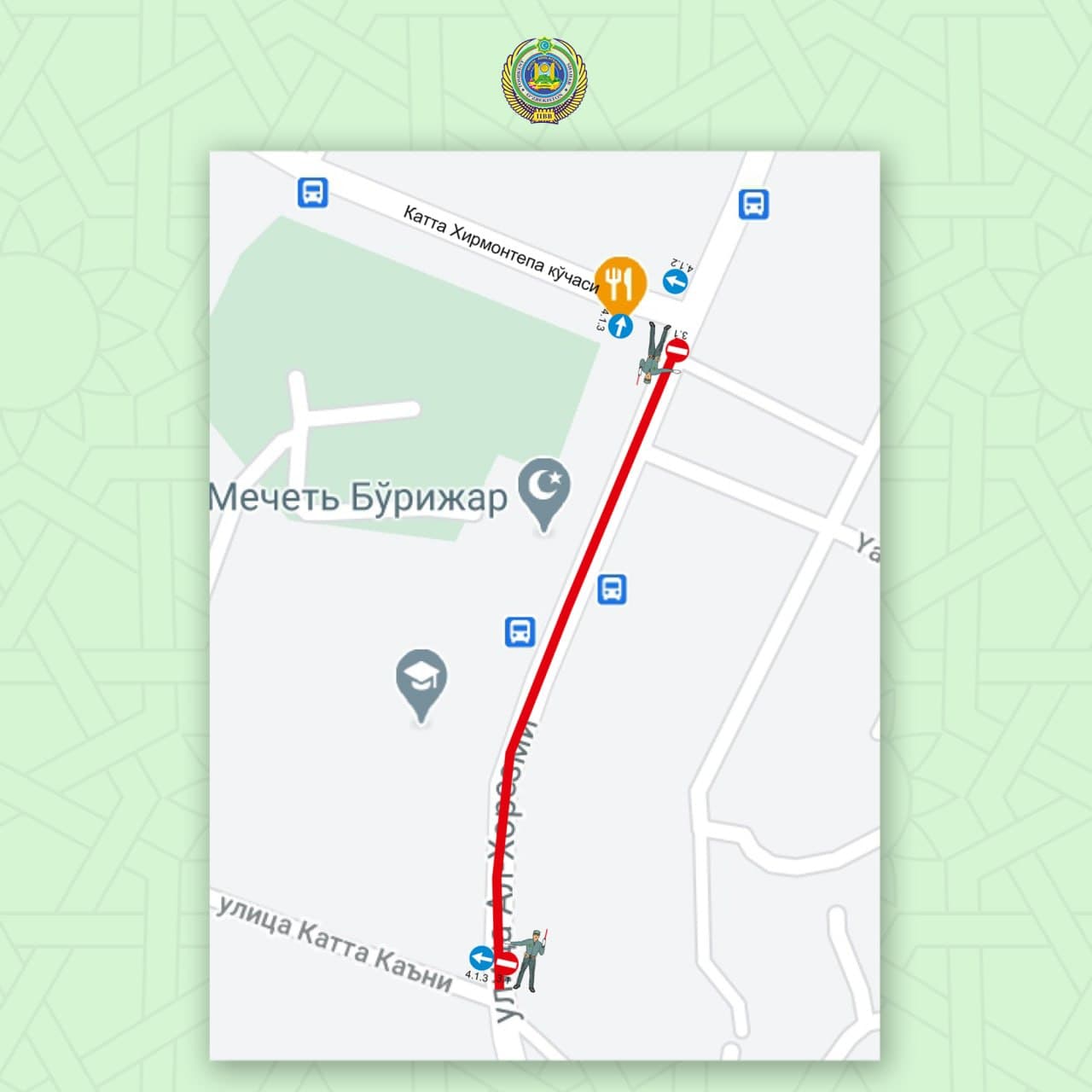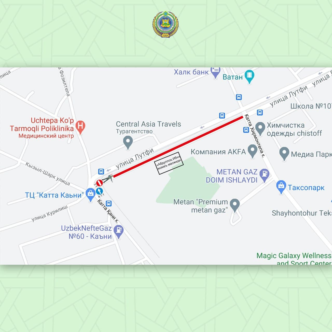 - Лутфий кўчаси (фақат масжид томони, қарама қарши томон ҳаракат учун очиқ бўлади) Катта Қани кўчаси билан кесишмадан Катта Хирмонтепа кўчаси билан кесишган йўлгача;