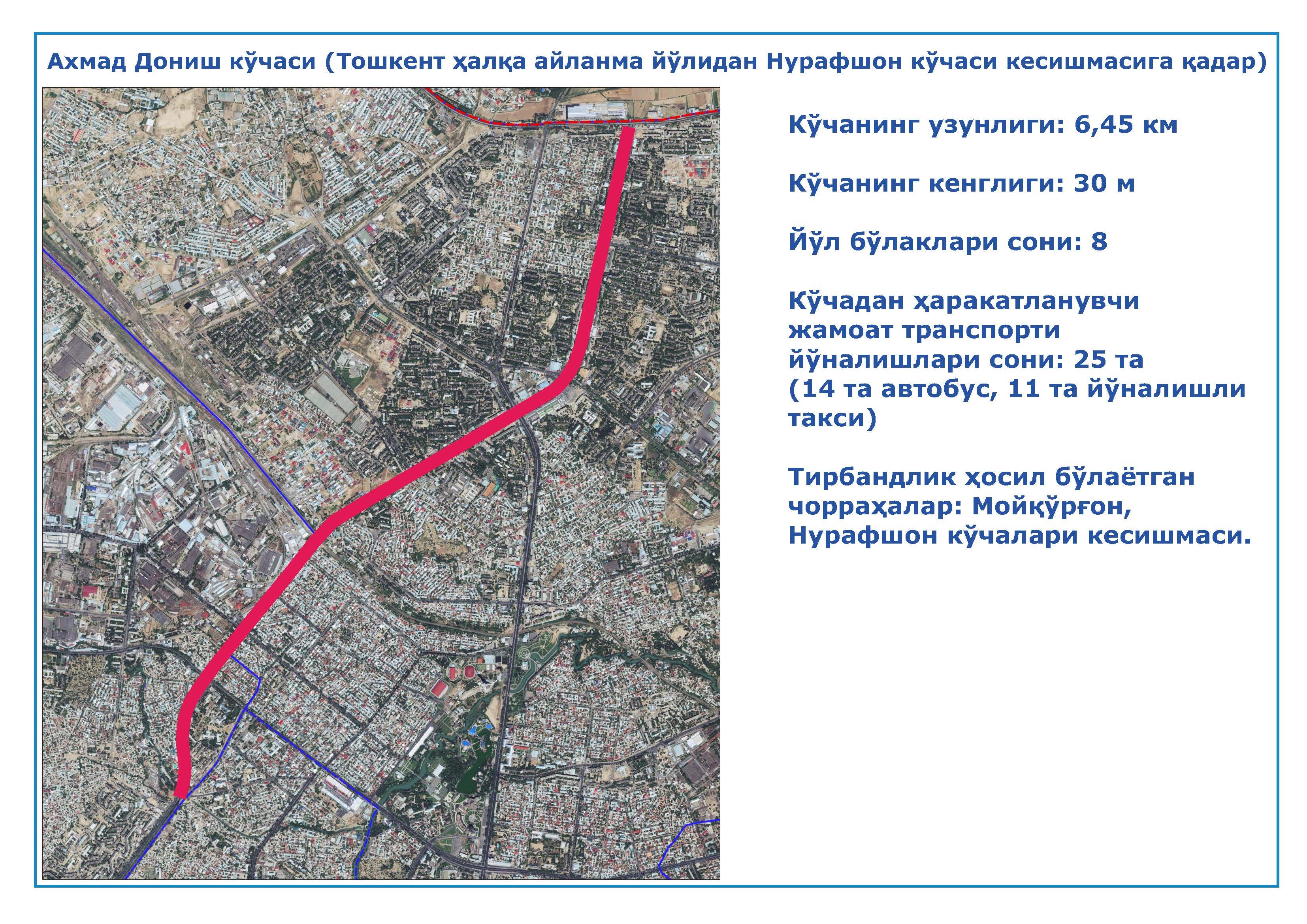 9. Ахмад Дониш кўчаси (Тошкент ҳалқа айланма йўлидан Нурафшон кўчаси кесишмаси);