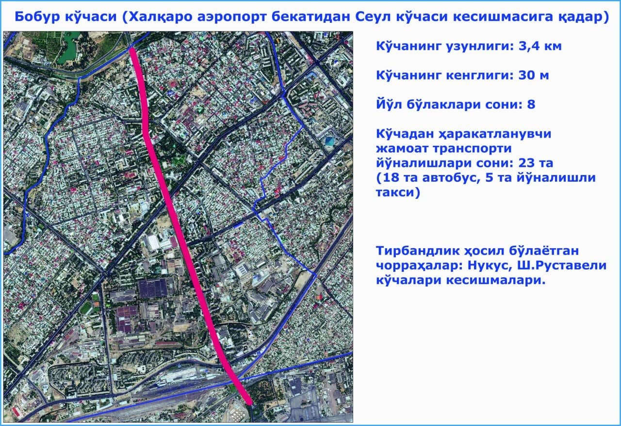 1. Бобур кўчаси (Халқаро аэропорт бекатидан Сеул кўчаси кесишмаси);