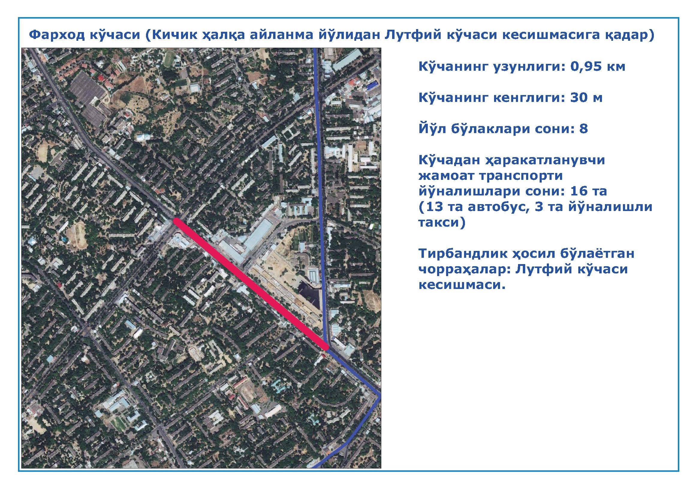 4. Фарход кўчаси (Кичик ҳалқа айланма йўлидан Лутфий кўчаси кесишмаси);