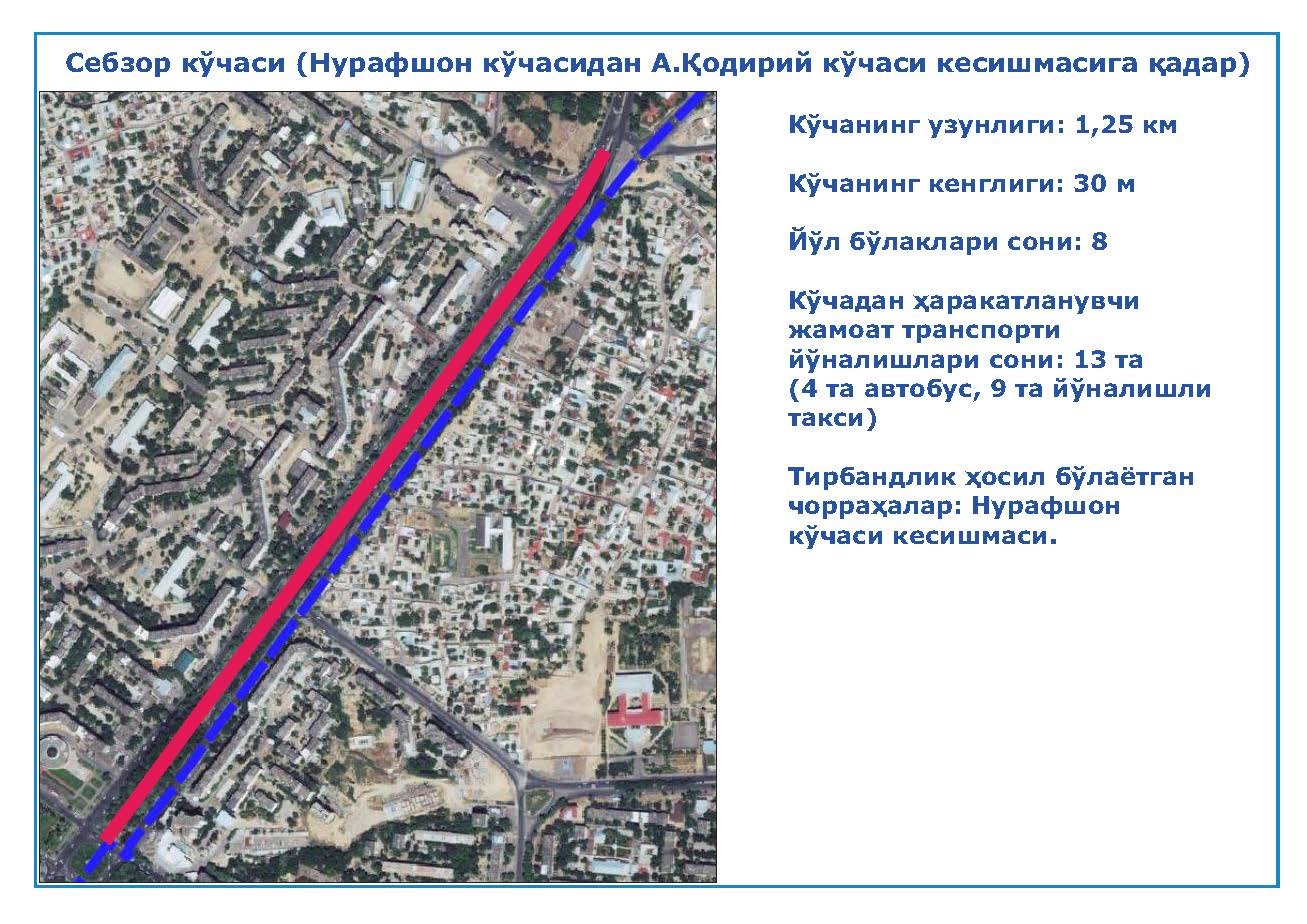 10. Себзор кўчаси (Нурафшон кўчасидан Абдулла Қодирий кўчаси кесишмаси)га қадар алоҳида йўлаклар ажратиш кўзда тутилмоқда.