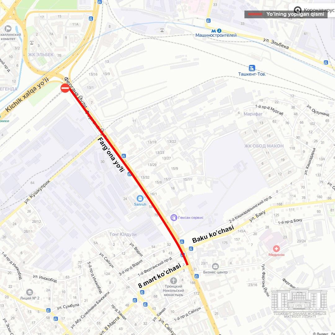 Тошкент шаҳар ҳокимлиги Матбуот хизматининг берган хабарига кўра, жорий йилнинг 8 июнь куни соат 23:00 дан Фарғона йўли ва Кичиқ халқа йўли кўчалари кесишмасидан Фарғона йўли кўчасининг 8 март кўчаси билан кесишмасигача бўлган автомобиль йўлининг бир томонида реконструкция ишлари бошланади.