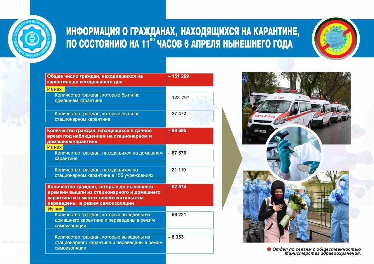 Шу йилнинг 6 апрель, соат 11:00даги ҳолат бўйича карантин кузатувида бўлган фуқаролар тўғрисида маълумот