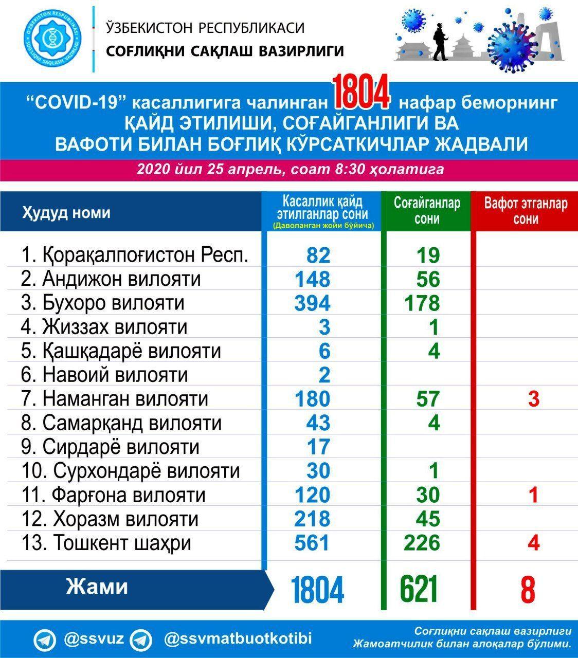 UZ: COVID-19 касаллигига чалинган 1804 нафар беморнинг қайд этилиши, соғайганлиги ва вафоти билан боғлиқ кўрсаткичлар жадвали