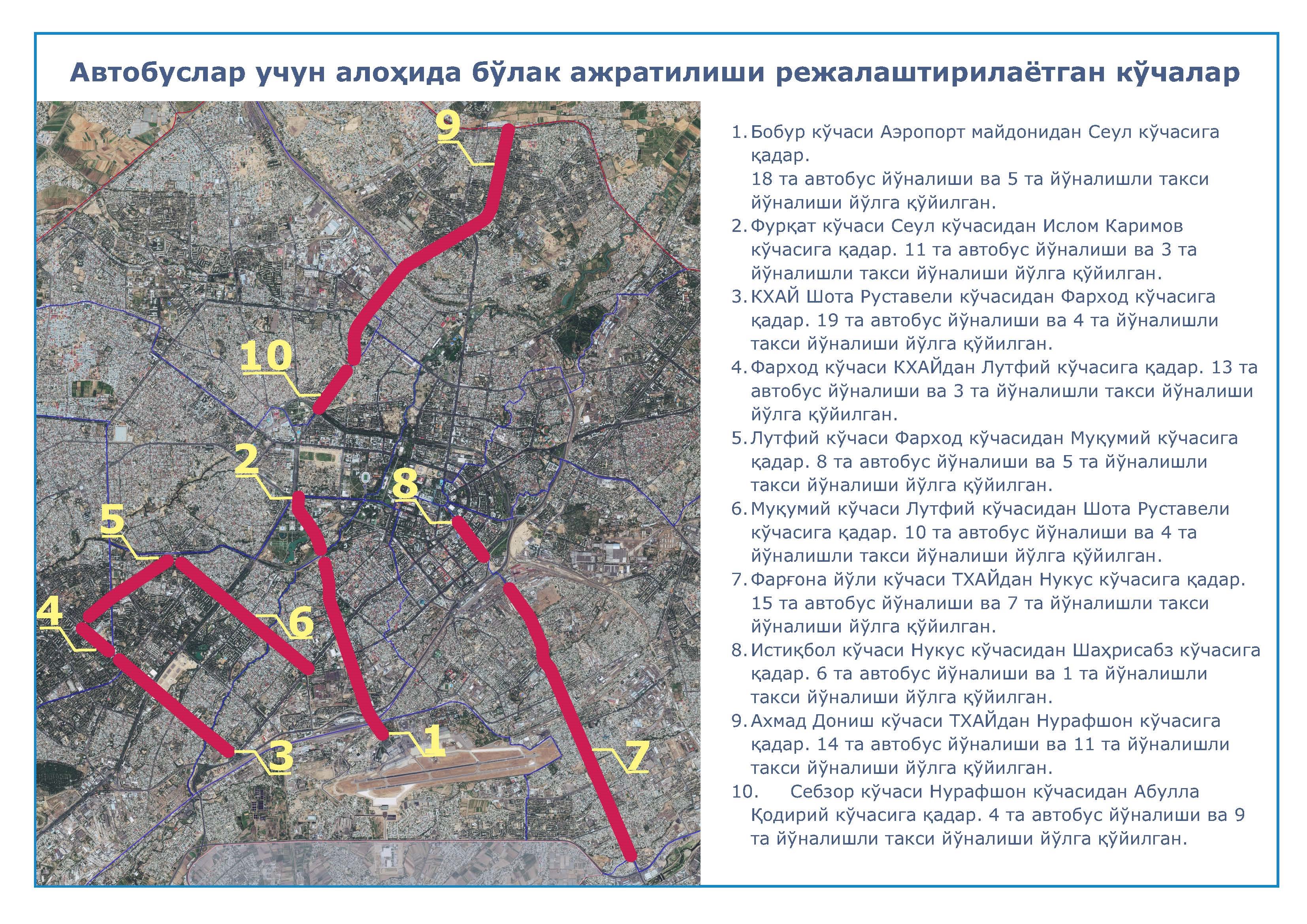 Пойтахтдаги 10 та кўчаларда махсус автотранспортлар ҳаракатланиши учун алоҳида ажратилган...