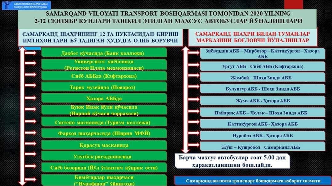 Сурхондарё вилоятида бўлиб ўтадиган имтиҳон кунларида абитуриентлар учун автобус ва йўловч...