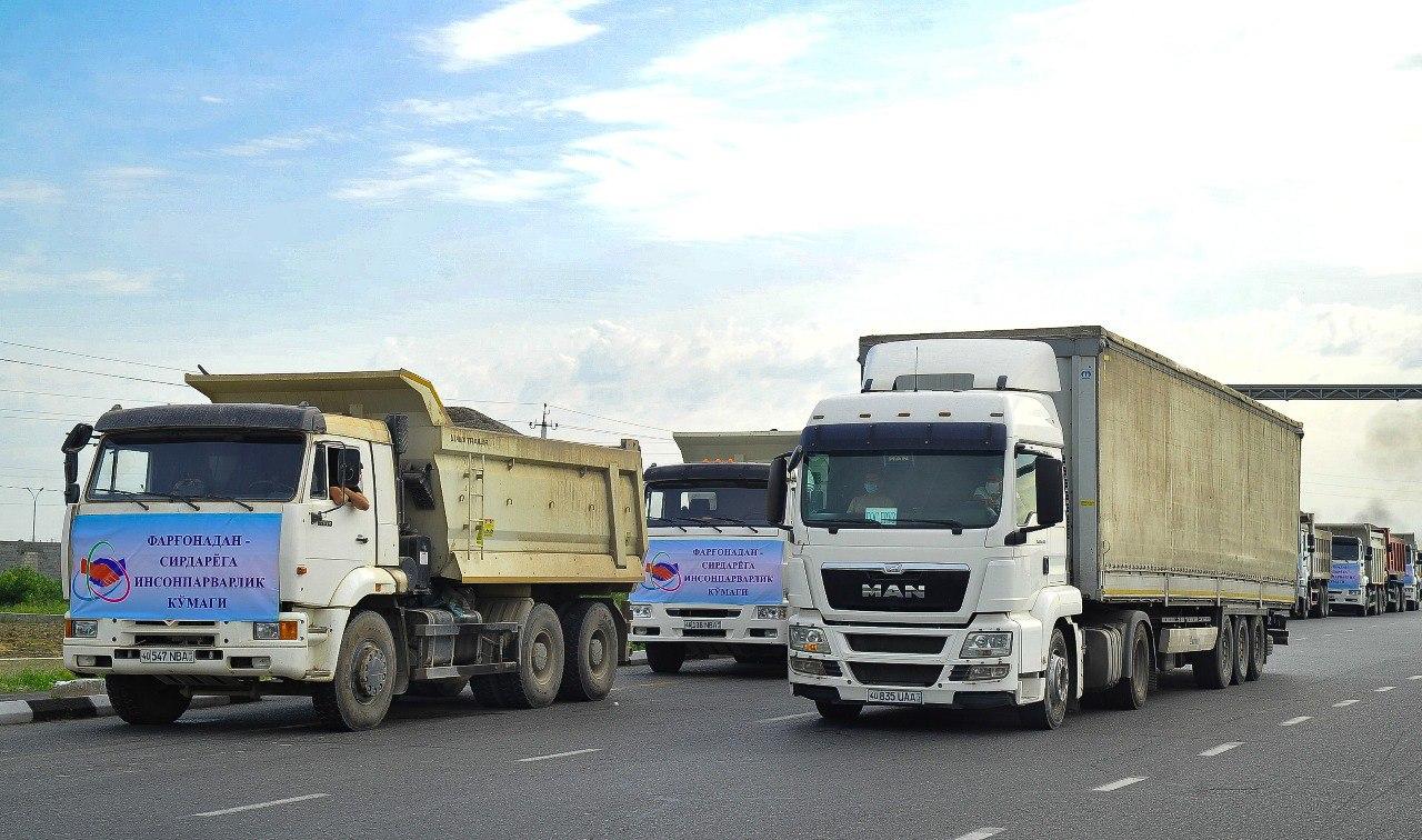 Сардоба сув омборининг бузилган қисмини қайта қуришда юк транспорт воситаларида фарғоналик...