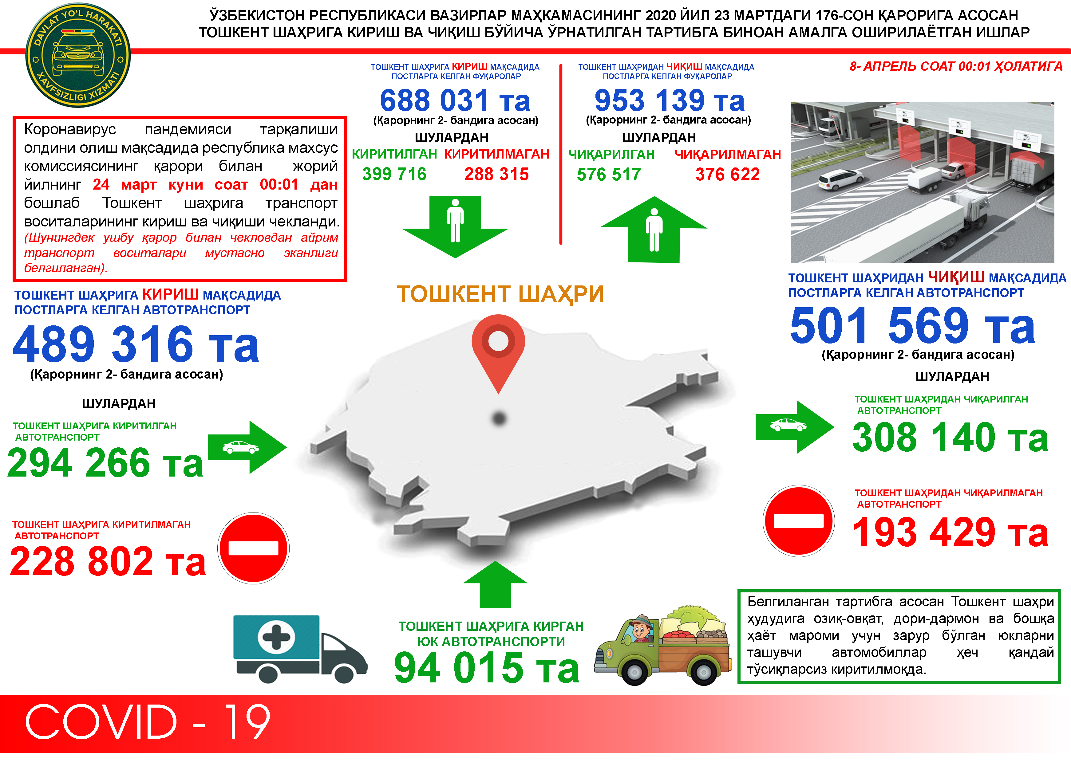 Пойтахтга карантин постлари орқали кирган ва чиққан транспорт воситалари, фуқаролар ҳамда...