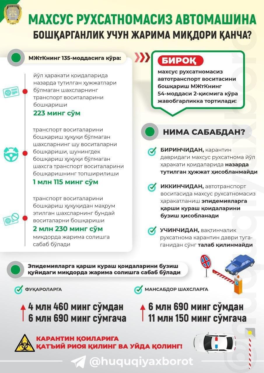 Хоразмда карантин қоидаларини бузган ҳайдовчиларга чоралар кўрилиши давом этмоқда