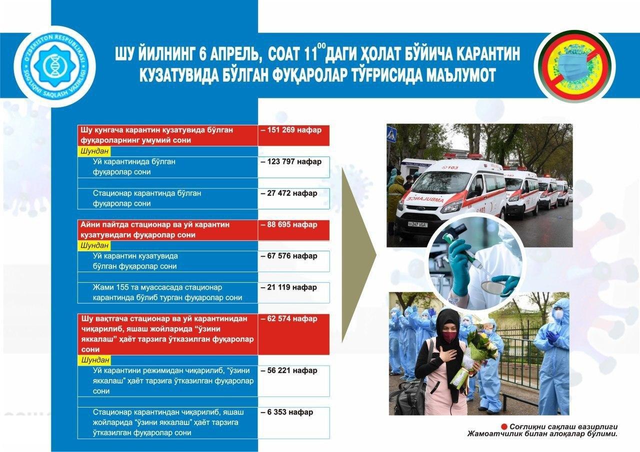 Шу йилнинг 6 апрель, соат 11:00даги ҳолат бўйича карантин кузатувида бўлган фуқаролар тўғр...